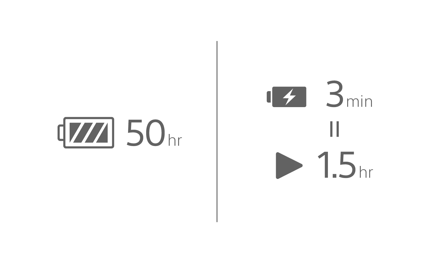עם חיי סוללה של עד 50 שעות, תוכלו ליהנות מהמוזיקה האהובה בלי לחשוש שהסוללה תיגמר. ואם הסוללה כבר נמוכה – טעינה מהירה של שלוש דקות מעניקה לכם עד שעה וחצי של האזנה.