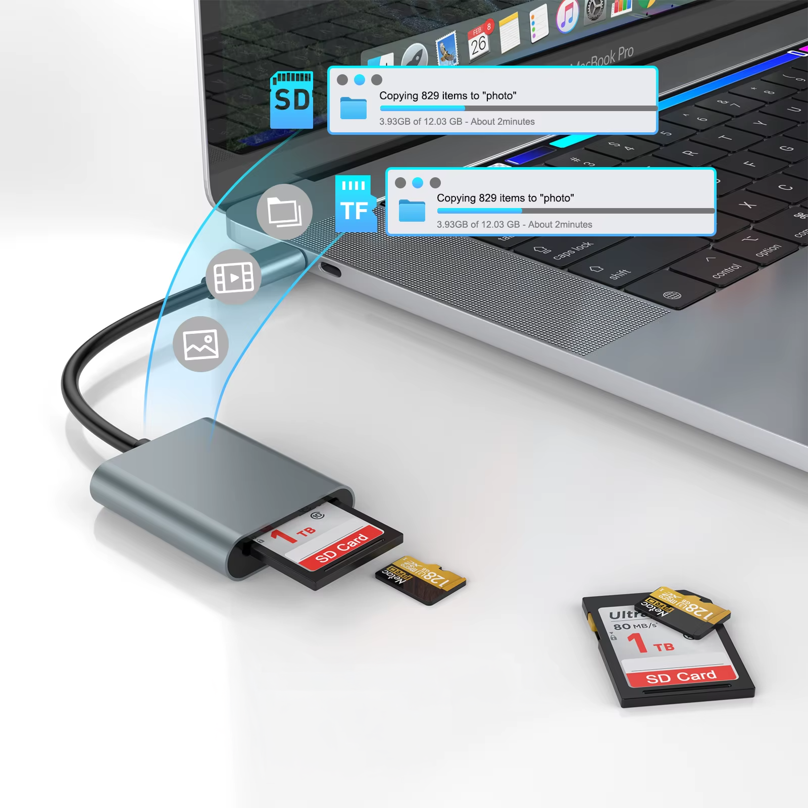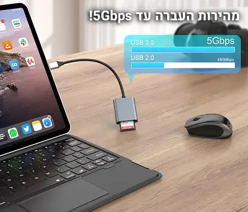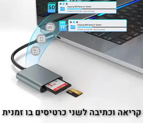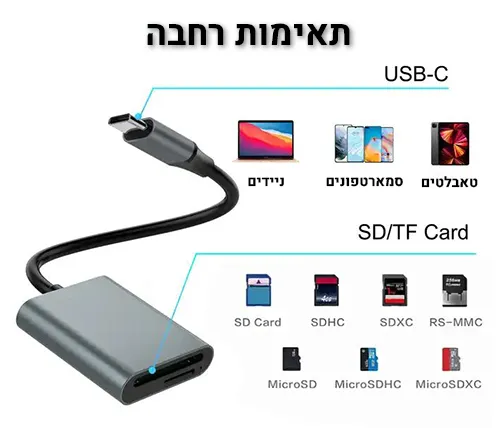 הקורא תומך בכרטיסי SD ו-TF / MicroSD, כולל גרסאות SDHC, SDXC ועוד. מושלם למצלמות DSLR, מצלמות אקשן, רחפנים, מצלמות רכב, טלפונים וציוד מקצועי נוסף. הוא מזהה את הכרטיסים מיד ומאפשר גישה מלאה לנתונים בלי מאמץ.