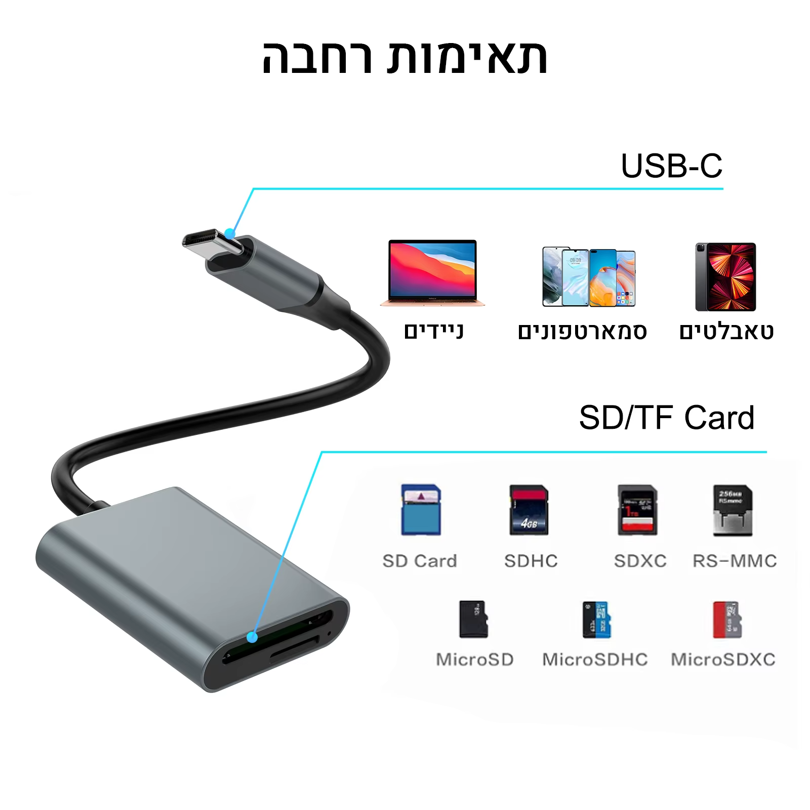 הקורא מתאים למחשבים נייחים, מחשבים ניידים, סמארטפונים וטאבלטים בעלי תמיכה ב-OTG. בין אם אתם במשרד, בבית או בשטח, תוכלו לגשת לקבצים שלכם בכל רגע. זהו כלי עבודה אמיתי לכל מי שצריך גישה מהירה ובטוחה לנתוני המדיה שלו.