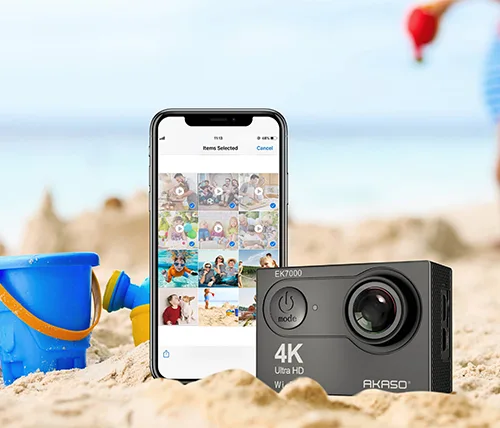 מצלמת אקסטרים EK7000 מבית AKASO עם חיישן 20MP עם עדשה רחבה של 170º כולל ערכת נלווים רחבה עם מתקנים לכל שימוש כולל שלט וסוללה ספייר. תוכלו לשלוט על המצלמה שלכם באמצעות אפליקציה או בשלט. ועם האפליקציה בטלפון ניתן לערוך ולשתף תמונות עם סרטונים ישירות מהמצלמה ללא צורך במחשב