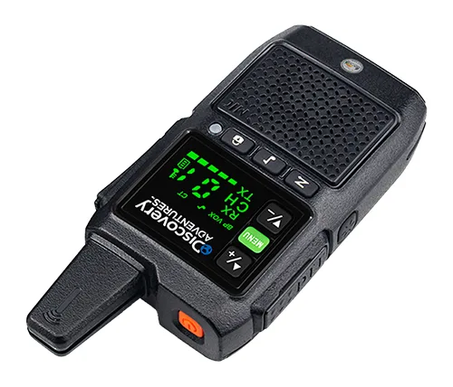 זוג מכשירי קשר איכותיים מבית דיסקברי דגם DS-820 עם מסך תפריט רחב וסאונד נקי בשידור, טווח קליטה עד כ-5 ק"מ, כולל 16 ערוצים