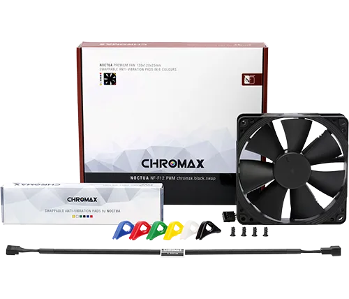 מאוורר למארז 12 ס"מ Noctua NF-F12 chromax.black.swap PWM בצבע שחור עם רפידות נגד ויברציות בצבעים להחלפה