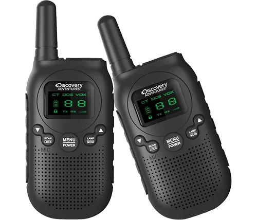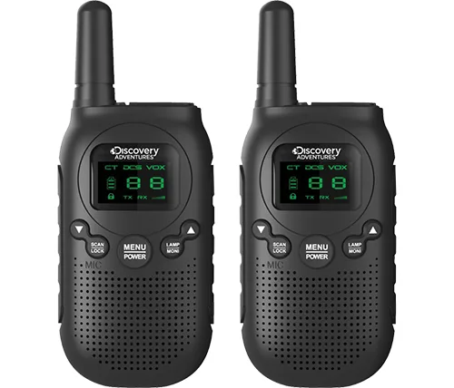 זוג מכשירי קשר לפנאי וטיולים מבית Discovery עם 8 ערוצי קליטה ושידור בתדרים PMR446, צג ערוצים, סוללות בהספק 1500mAh וטווח קליטה עד 6 ק"מ