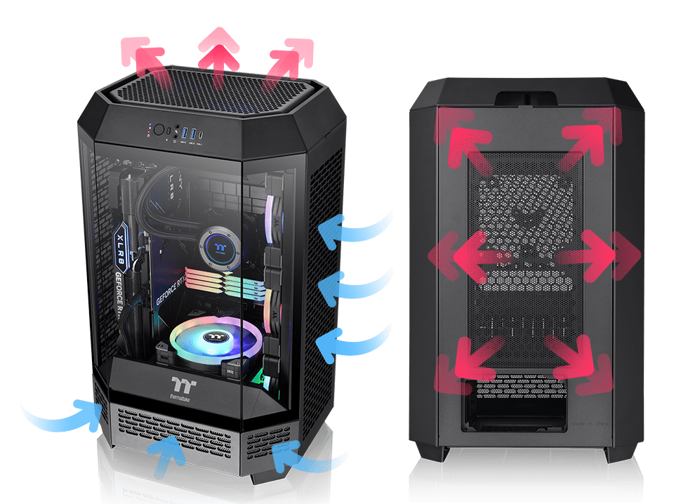 למרות העיצוב האנכי, המארז מצויד בכניסות ויציאות אוויר יעילות, לשמירה על טמפרטורות פנימיות נמוכות בכל עת.