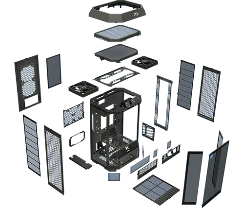 המארז כולל שלושה פאנלים קדמיים מזכוכית מחוסמת בעובי 3 מ"מ ושני פאנלים מחוררים בצדדים, כולם ניתנים להסרה קלה ללא צורך בכלים.