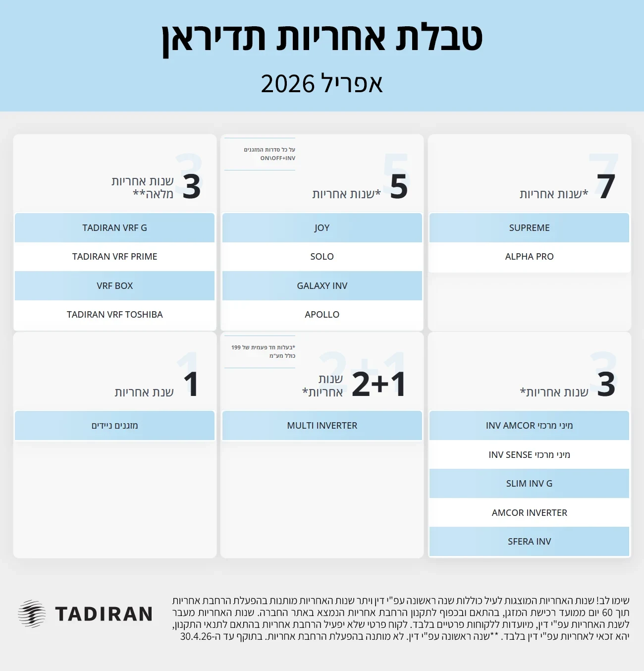 האחריות כפופה לאמור בתעודת האחריות ולתנאי היבואן. למוצרים אשר להם מעל שנה אחריות, מעבר לשנת האחריות הראשונה, האחריות מוגבלת וכפופה לאמור בתעודת האחריות ולתנאי היבואן