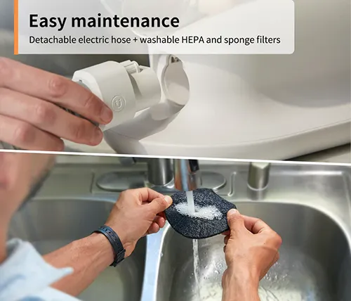 כולל כבל חשמלי הניתן לניתוק לתחזוקה והחלפה קלים. מסנני HEPA וספוג הניתנים לשטיפה להארכת חיים לחלקים מתכלים.