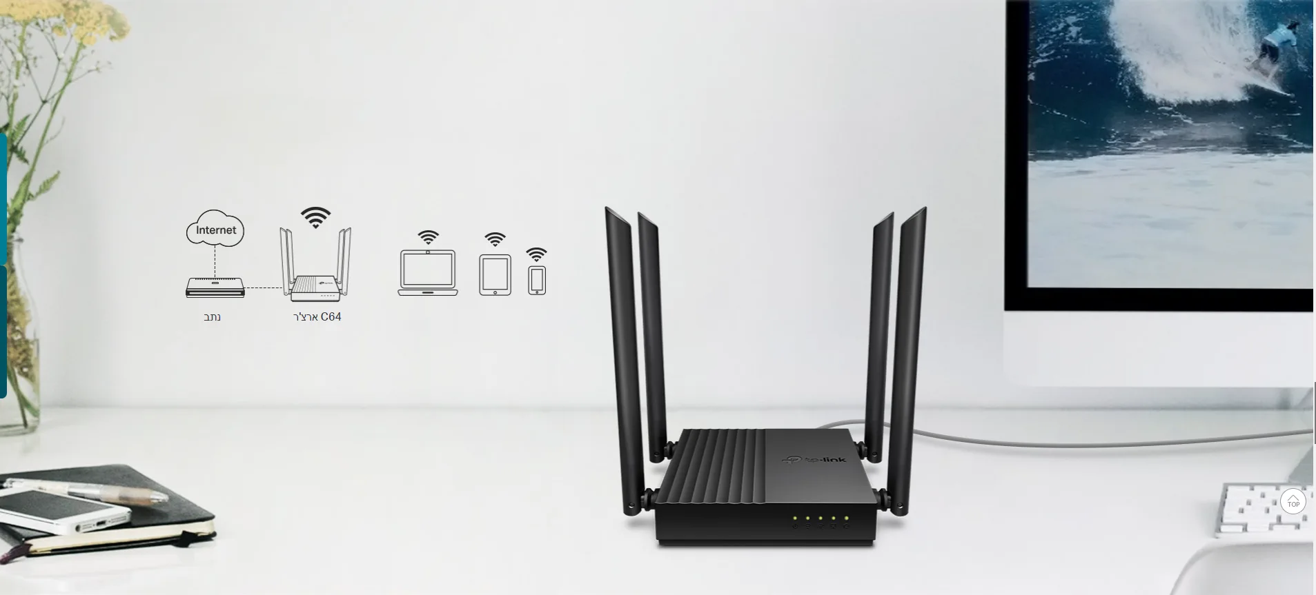 AC1200 WiFi עם MU-MIMO ‡ , הוא מייצר חיבורים בו-זמניים מרובים כדי שתוכל ליהנות ממהירויות גבוהות יותר ויציבות רבה יותר. לא עוד עומס ברוחב פס או זמן אחזור. תהנה מבידור ללא הפסקה בכל המכשירים שלך - ללא עיכובים.