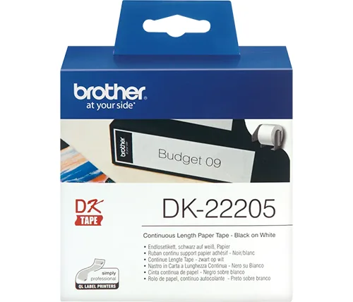 גליל סרט תוויות נייר רציף Brother DK-22205 שחור על לבן ברוחב 62 מ"מ לשימוש עם מדפסת Brother QL-800