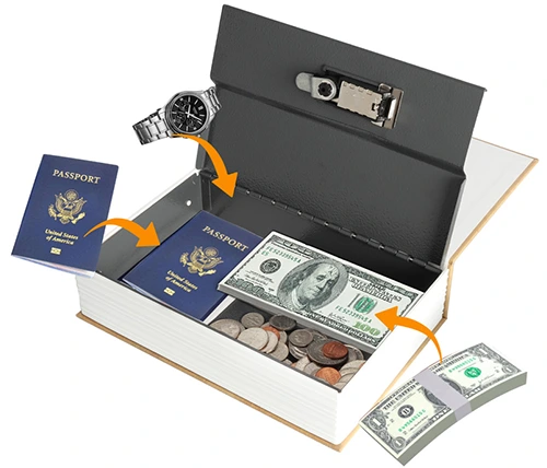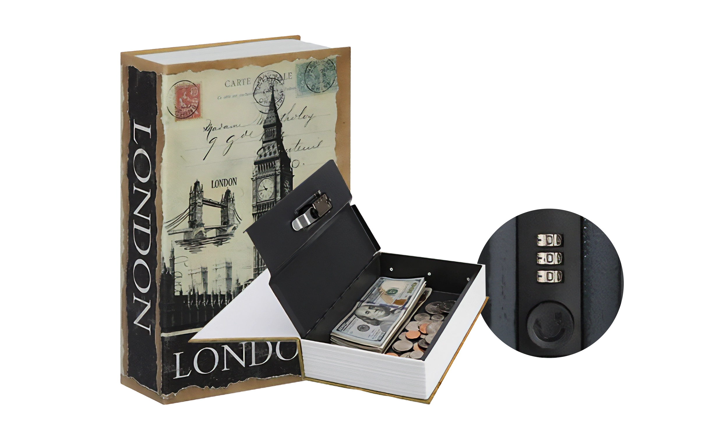 מתאימה לאחסון כסף מזומן ודברי ערך, עם קוד מספרי. ממש נראית כמו ספר אמיתי, כמו כן, לבית ולמשרד, וניתן להסתיר בין שאר הספרים על המדף.