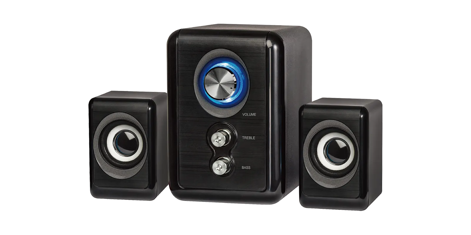 מערכת רמקולים 2.1 קומפקטית Ivory Sound SUB300 בהספק כולל של 11W RMS ותאורת RGB מסביב לעוצמת השמע, שליטה על עוצמת הקול והבס, טווח תדרים 40-18,000Hz וחיבור AUX 3.5 מ"מ