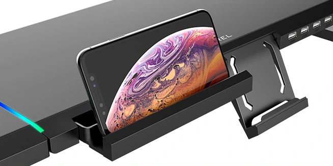 המעמד כולל מגירת אחסון אינטגרלית ודיסקרטית, המאפשרת לשמור פריטים קטנים כמו דיסק־און־קי, אוזניות, כבלים, עטים ואביזרים נוספים – תמיד בהישג יד ותוך שמירה על שולחן עבודה מסודר ונקי.