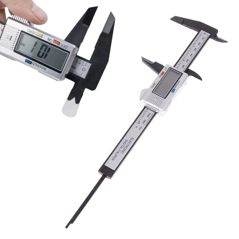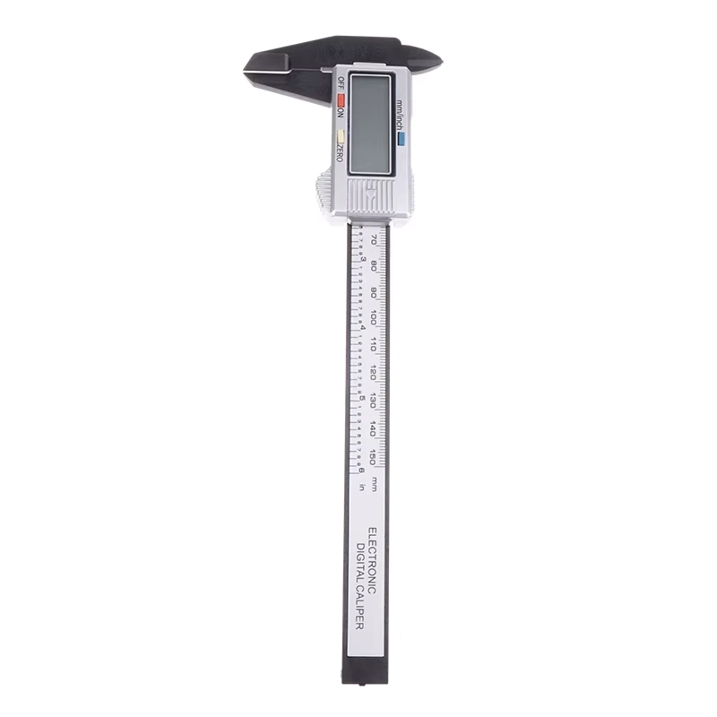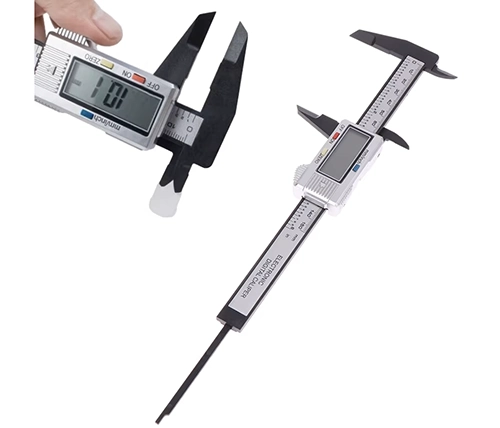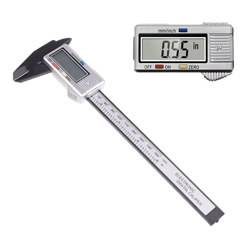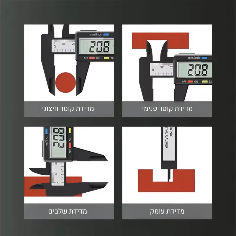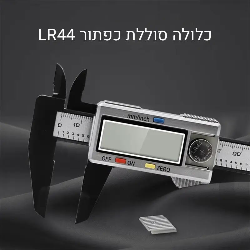 קליפר דיגיטלי עשוי מסיבי פחמן חזקים במיוחד, למדידת קוטר פנימי, קוטר חיצוני, מדידת עומק ומדידת שלבים, מידה מינימלית לקריאה 0.1 מ''מ, פועל עם סוללת כפתור LR44