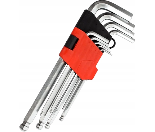 סט מפתחות אלן כדורי בינוני 9 יחידות מבית Ivory Tools כולל גדלים נפוצים (1.5-10 מ"מ), ראש כדורי להברגה בזווית של עד 25° לגישה נוחה במקומות קשים, עיצוב בינוני לאיזון בין מומנט כוח ונוחות עבודה, פלדה מוקשחת Chrome Vanadium לעמידות גבוהה, ציפוי נגד חלודה ומחזיק פלסטיק קשיח לארגון מסודר